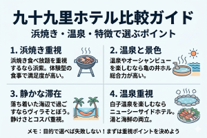 九十九里周辺で宿を比較するときは、先に見る項目を決めておくと迷いにくいです。